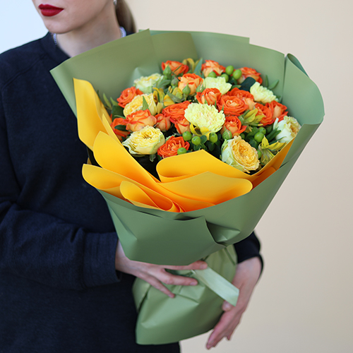 Букет "Осенний луч" из роз, гиперикума, альстромерий и диантусов