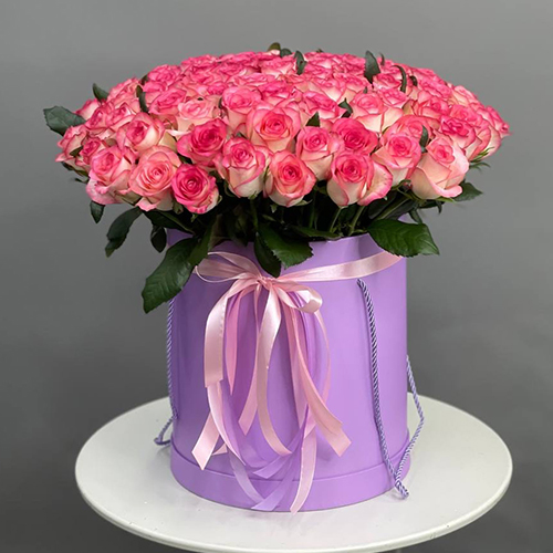 Композиция в шляпной коробке "Индиана" из 101 розы Джумилия